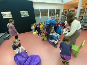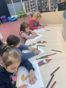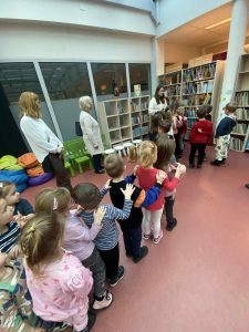 Podczas spotkania przedszkolaki dowiedziały się, jak należy zachowywać się w bibliotece, w jaki sposób wypożycza się książki oraz jak dbać o nie, aby mogły służyć innym czytelnikom. Pani Kasia – bibliotekarka w ciekawy i przystępny sposób opowiedziała o swojej pracy oraz zaprezentowała dzieciom różnorodne książki przeznaczone dla najmłodszych.