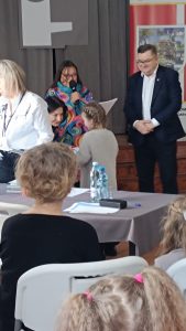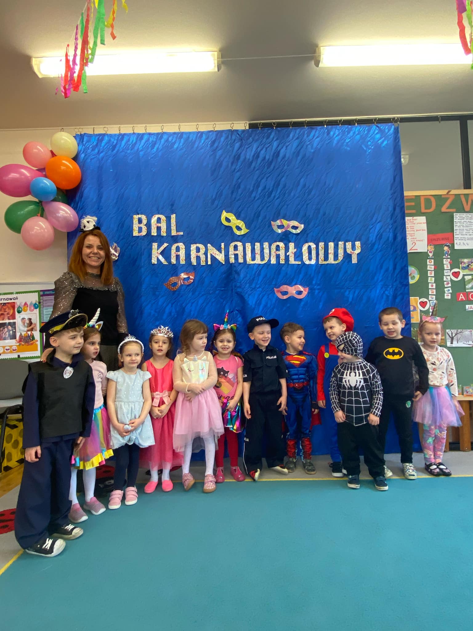 Już od rana przedszkolaki przybywały do szkoły w pięknych, kolorowych strojach – można było spotkać księżniczki, superbohaterów, zwierzątka, a nawet postacie z bajek. Sala balowa zamieniła się w magiczne miejsce ozdobione balonami i serpentynami, a wesoła muzyka zachęcała do wspólnej zabawy.