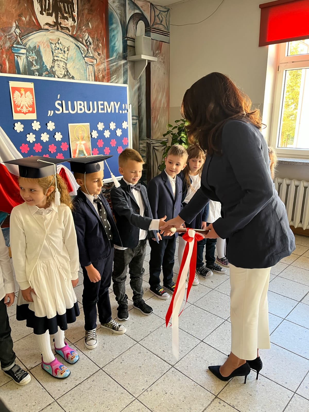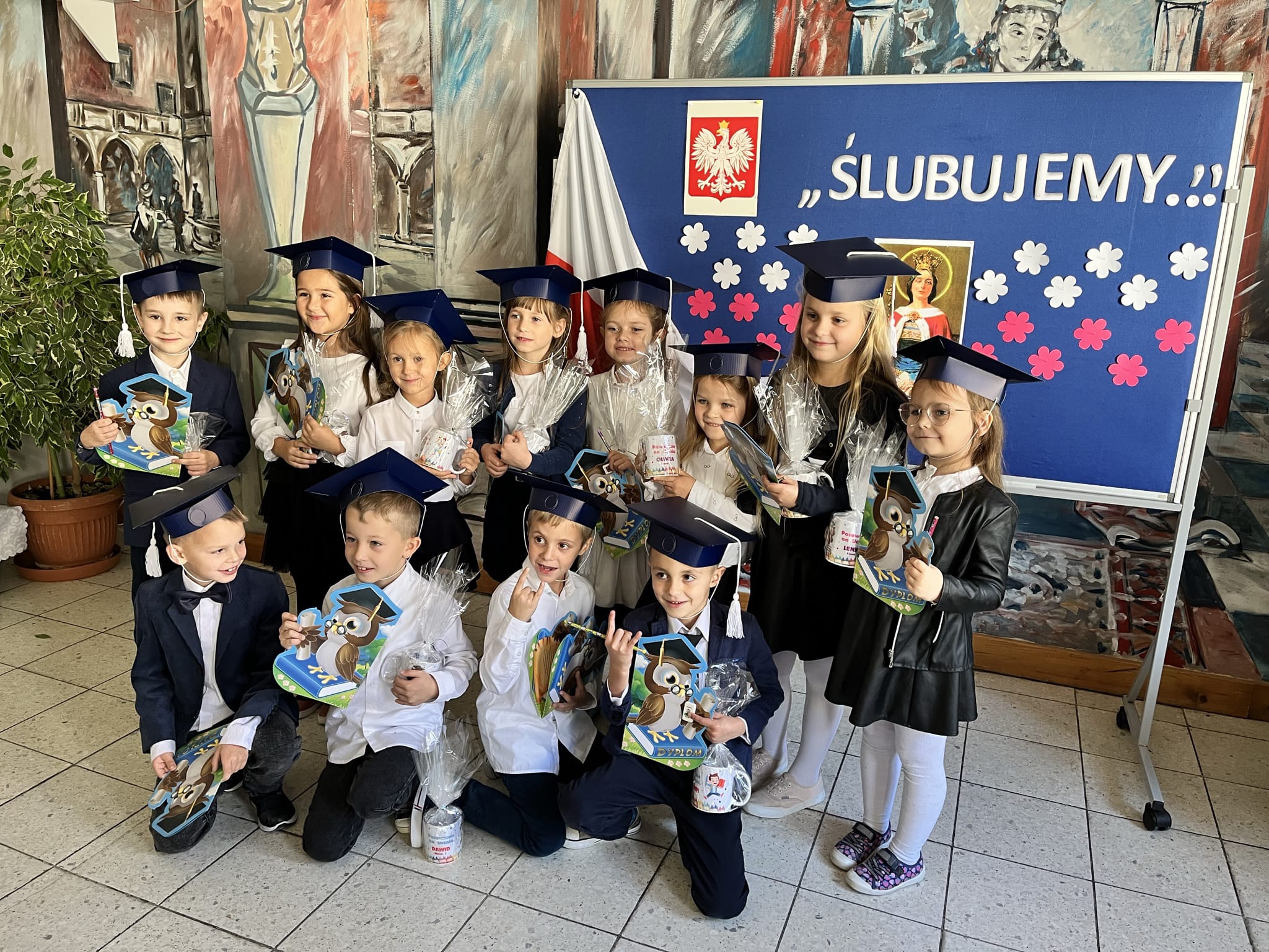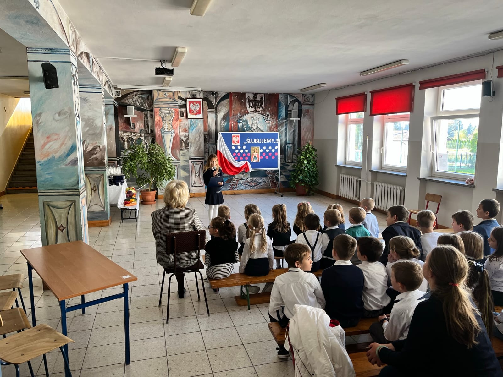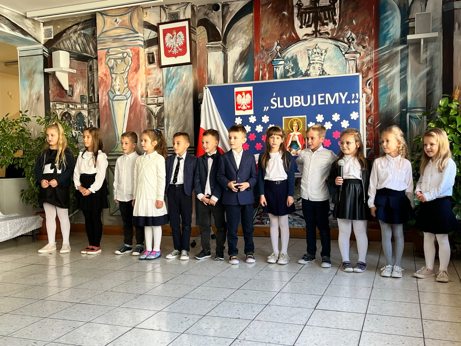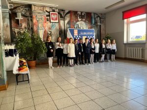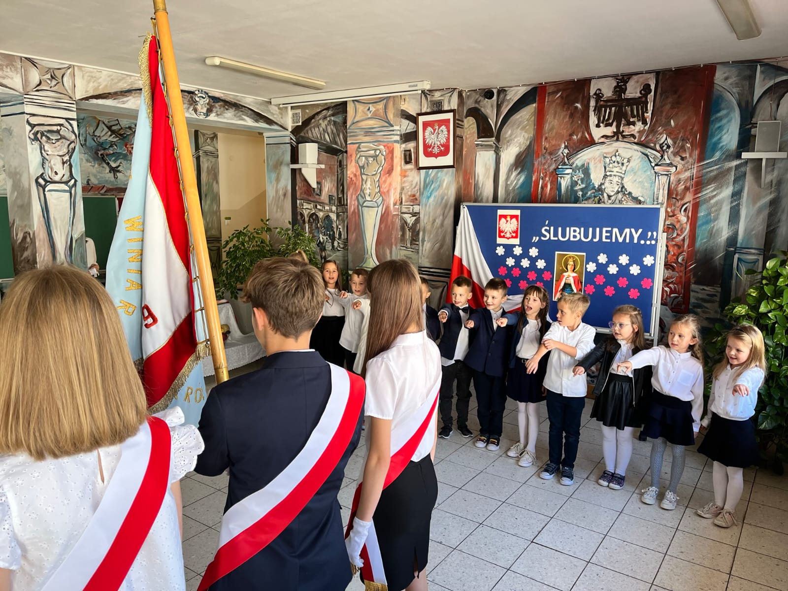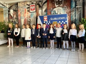 W dniu 13.10.2022 w naszej Szkole odbyło się uroczyste pasowanie uczniów. Na uroczystości nie zabrakło rodziców, zaproszonych gości, a także jury w składzie: Magda Gessler, prof. Jan Miodek, Anna Maria Wesołowska i policjant. Podczas uroczystości szanowne jury (uczniowie klasy III) sprawdzali wiedzę uczniów klasy I z zakresu zdrowego odżywiania, patriotyzmu, znajomości praw i obowiązków ucznia oraz zasad drogowych. Dzieci deklamowały wiersze, śpiewały piosenki oraz zatańczyły poloneza, na końcu złożyły uroczystą przysięgę: