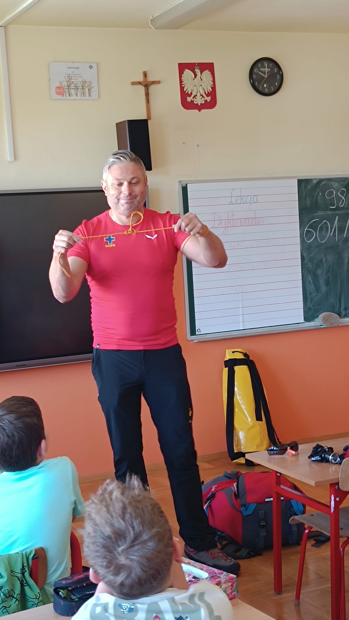 W dniu 11.06 uczniowie klasy 1 spotkali się z ratownikiem GOPRu Panem Wojciechem Badurą. Na spotkaniu dowiedzieli się o akcjach ratowniczych w górach, sposobach udzielania pomocy poszkodowanym, sprzęcie ułatwiającym pracę w trudnych warunkach. Mieli możliwość trenowania na fantomie masażu serca. Oglądali również filmy edukacyjne o akcjach ratowniczych. Bardzo podobały im się psy pomagające GOPRowcom.